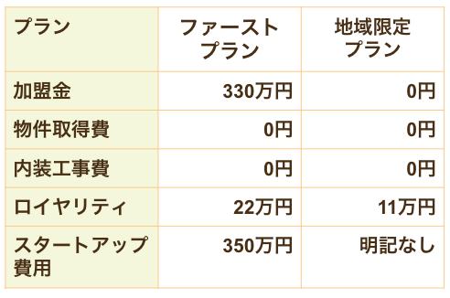プライムプランでは「初月ロイヤリティ0円」等の優遇があるが、2か月目以降で別の月額(サイト事例では40万円という例も)との情報が複数媒体で散見され、プランや条件で幅があります。※媒体によって差異があるため要確認。
