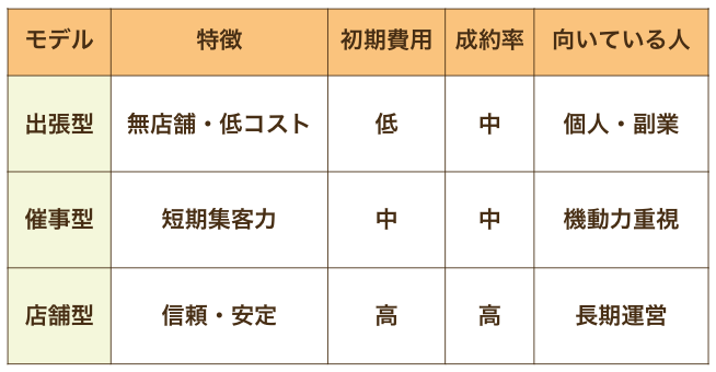 出張型・催事型・店舗型は、それぞれ初期費用、成約率、運営負担が異なります。優劣で選ぶのではなく、自分の資金・時間・リスク許容度に合った運営モデルを選ぶことが、無理のないスタートにつながります。