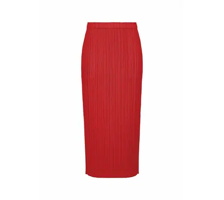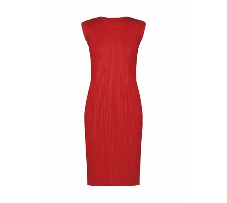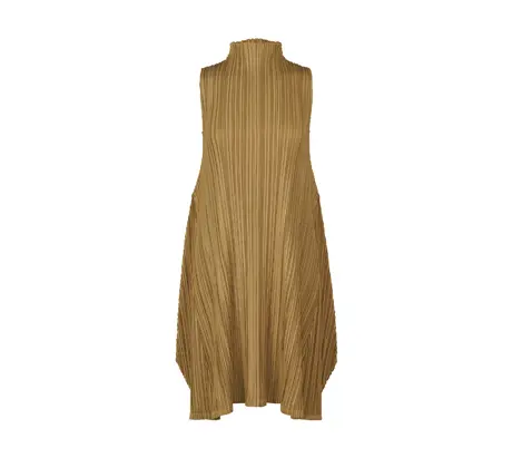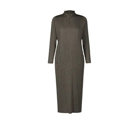 プリーツプリーズのワンピースは1枚でもお洒落に決まるシルエットの美しさが魅力。ウエストやヒップのラインがタイトなロングスカートタイプだとプリーツの美しさがより際立ちます。