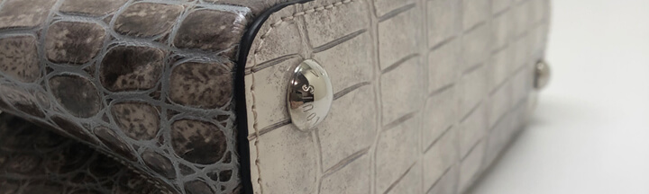 ハンドル付け根のパーツの細かい部分にもクロコが張られており、スタッズのメタル感とのバランスがたまりません。