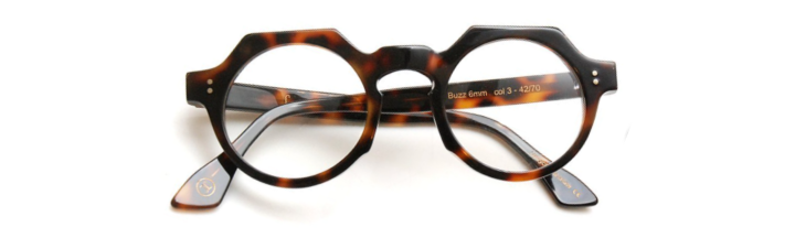 BUZZは希少なヴィンテージ生地をしたアップサイクリングコレクションで、レスカ創業60周年記念のモデルです。直線的でエッジが効いたブローラインと、コロンとしたラウンドのシェイプが特徴。ボリューム感が抑えられているため、性別を問わずにかけやすくなっています。