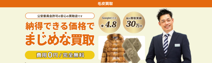 一回の査定で、商品が多ければ多いほど査定額がアップする「おまとめ査定」を実施しており、毛皮以外のアイテムも売却予定の方にも、おすすめの買取店となっています。