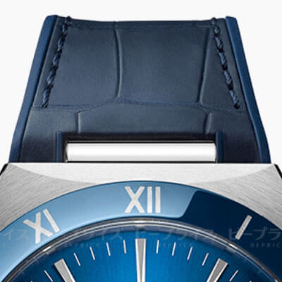 コンステレーションといえば、ケースサイドに施されたハーフムーンデザインが有名です。ケースの上下に弧を描くように配されたハーフムーン(半月)。ブレスレットとのつなぎ目をスムーズに見せてくれます。